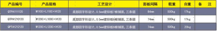 產(chǎn)品編號:QTPA1111120 產(chǎn)品規(guī)格:W1100×L1100×H120 托盤主孔:100mm 托盤側(cè)孔:80 mm 產(chǎn)品自重:16 kg 產(chǎn)品靜載:800kg 產(chǎn)品動載:600kg 上貨架載:不建議 產(chǎn)品配置:采用寶鋼鍍鋅板軋機成0.5*10*85 多筋骨面板10根,以間隔84mm 和6根板做腿+9個立撐組成。 產(chǎn)品用途:廣泛用于酒水、食品、化工、電子 等大量物品倉儲與周轉(zhuǎn)。 產(chǎn)品缺陷:不宜上貨架。