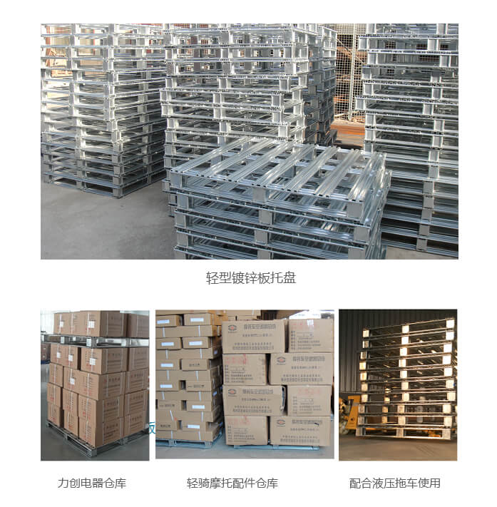輕型A型鍍鋅板托盤 產(chǎn)品用途: 本產(chǎn)品采用上海寶鋼大鋅花0.5—1.0mm厚的鍍鋅板軋壓變形,優(yōu)點質(zhì)量輕承重好,焊點處涂銀粉油漆或植物桐油防止焊點生銹。應(yīng)本產(chǎn)品熱鍍鋅層面工藝,防銹能力非常強,廣泛用于輕工業(yè)制造,如冷鏈、食品車間生產(chǎn)、酒水制造,電子制造倉儲與周轉(zhuǎn)。對比木板托盤免熏蒸,常作為隨貨底托,隨產(chǎn)品一次性出口。提示:不建議上貨架,如上貨架,主材厚度1.2mm。